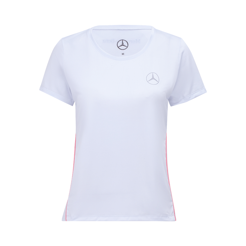 Camiseta feminina Fitness com modelagem exclusiva e design esportivo. Desenvolvida em tecido dry, tecido que oferece excelente conforto térmico, a peça possui logos Mercedes-Benz em transfer refletivo que aumentam a segurança e proporcionam visibilidade de 360 graus. Recortes laterais dão um charme especial à camiseta.